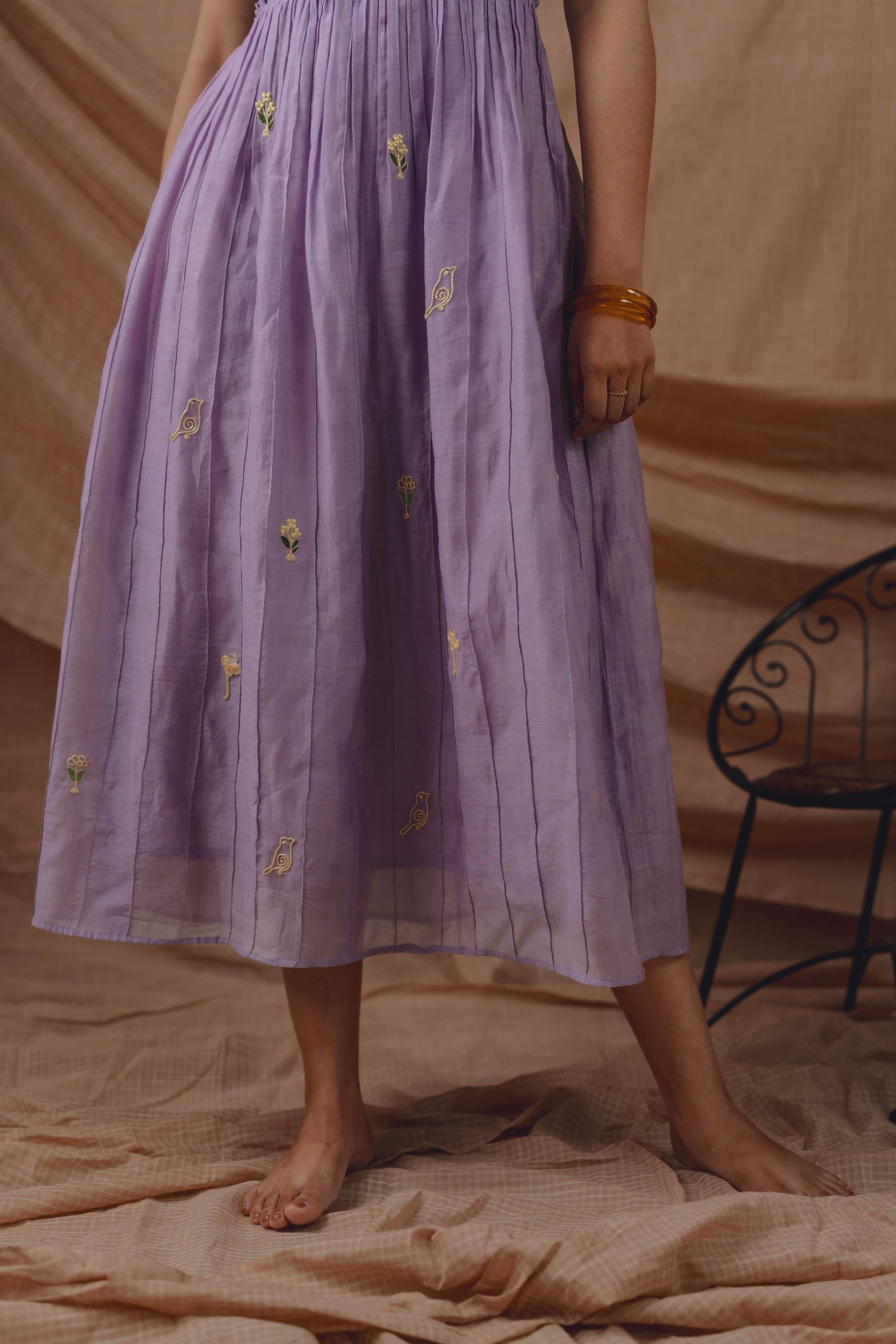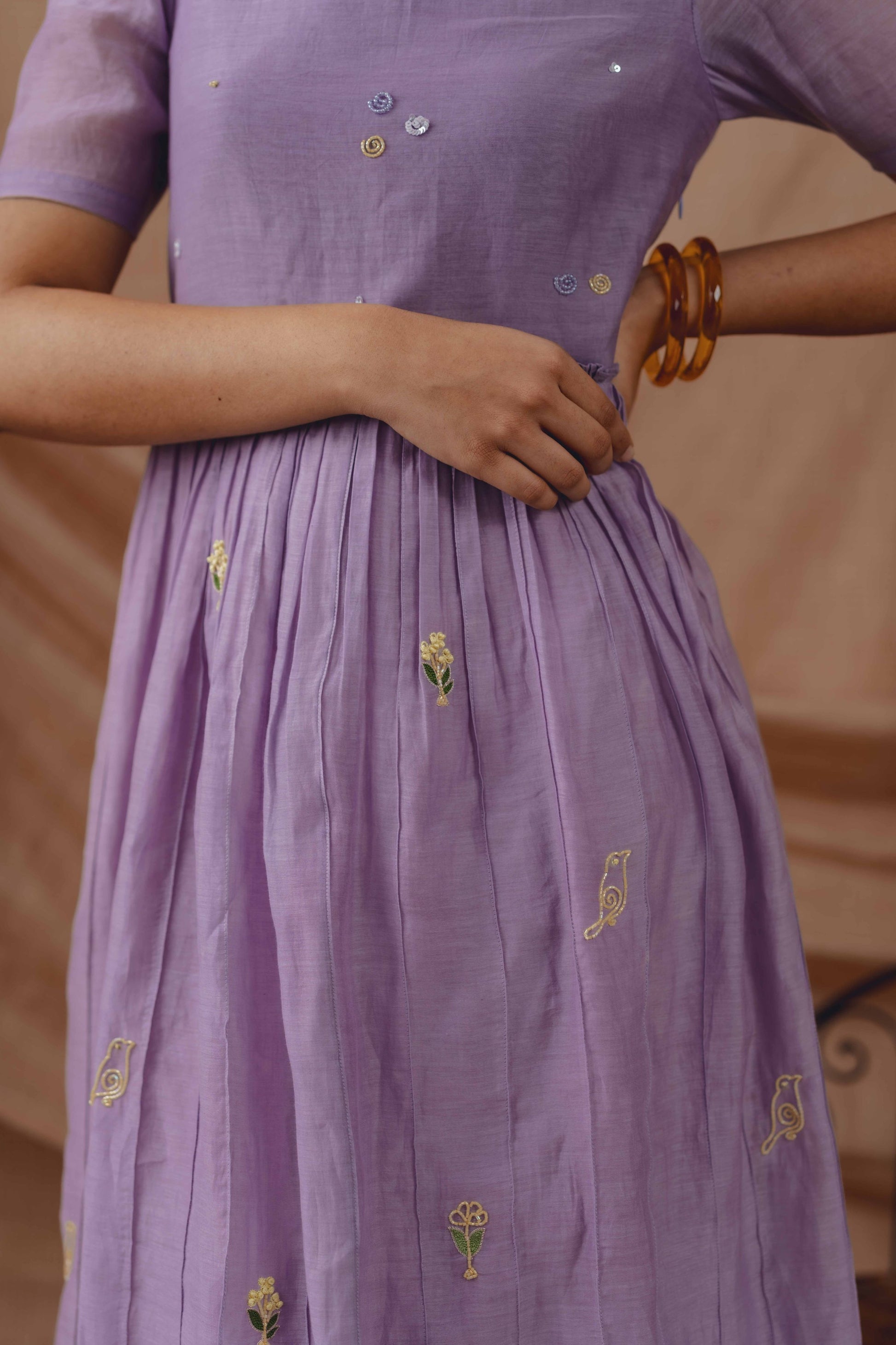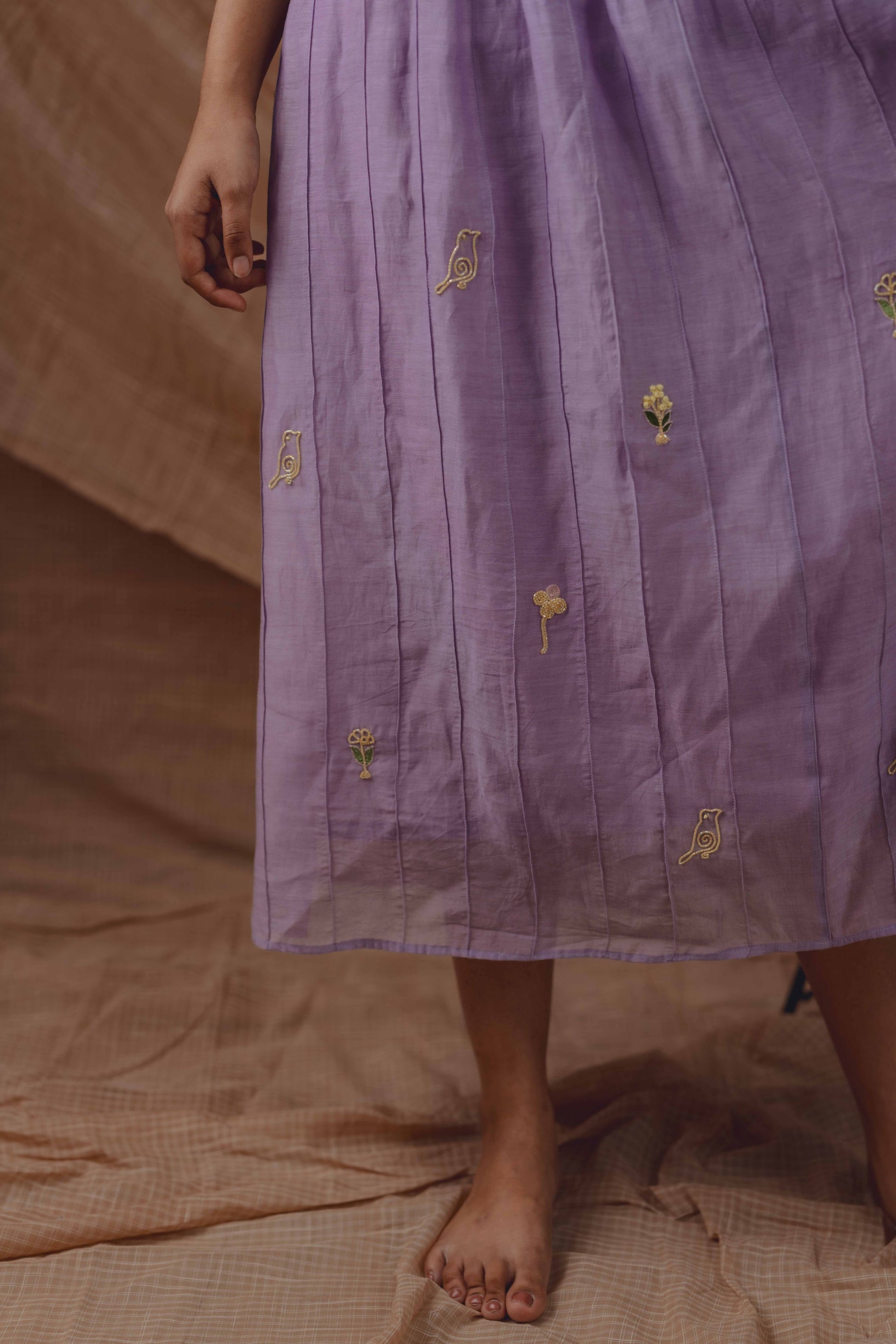 A soft lilac silhouette crafted in breathable handwoven fabric, detailed with delicate tonal pintucks and hand-embroidered motifs. Light, fluid, and thoughtfully made for everyday elegance.