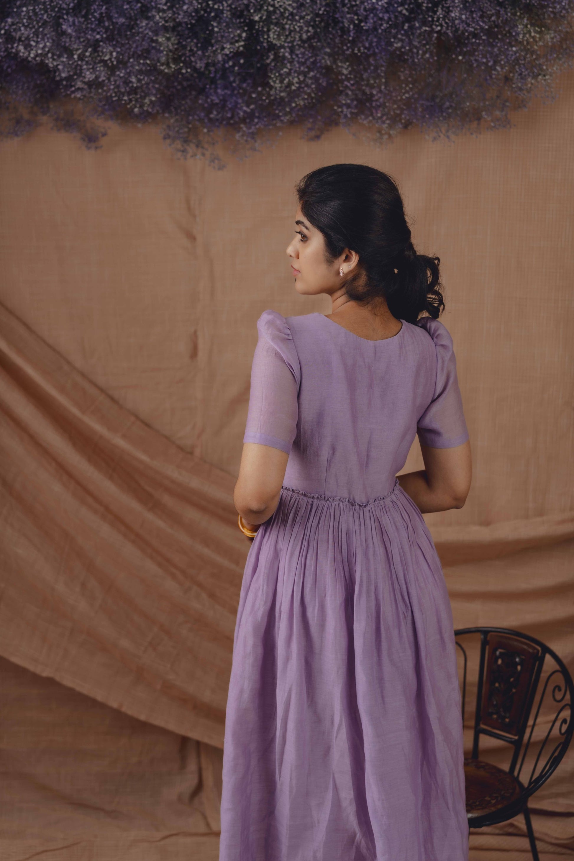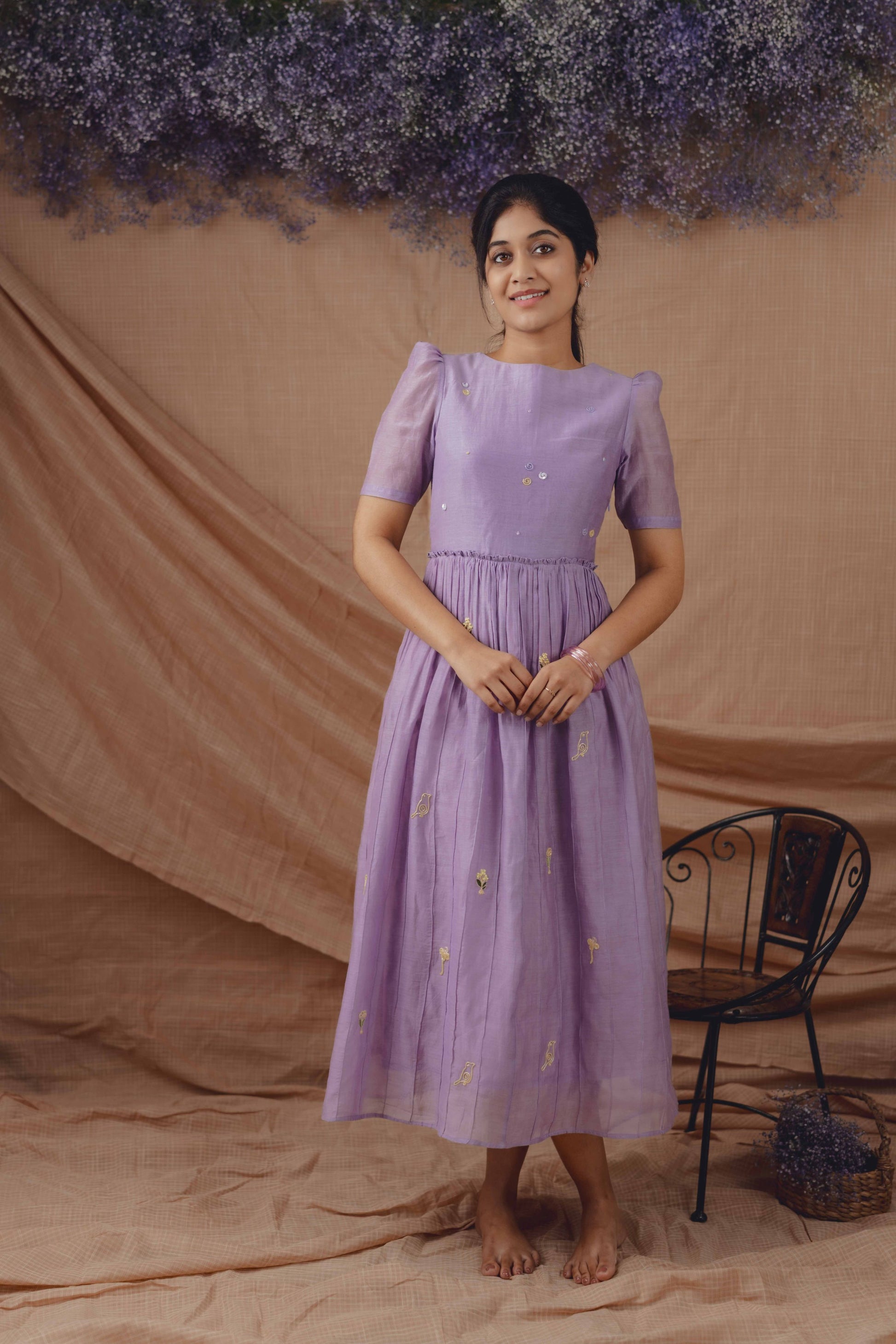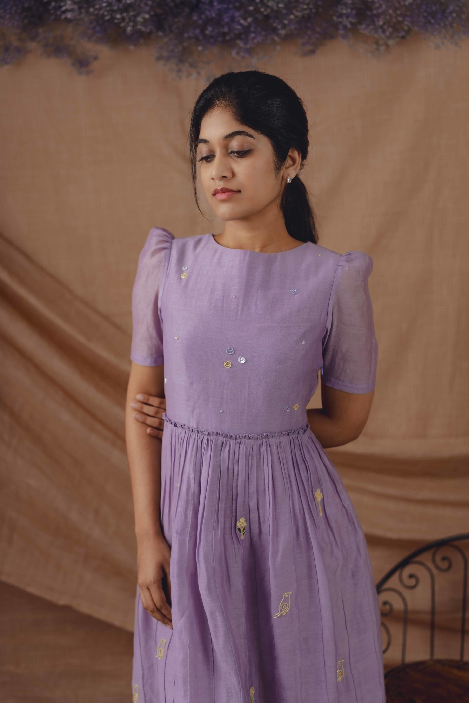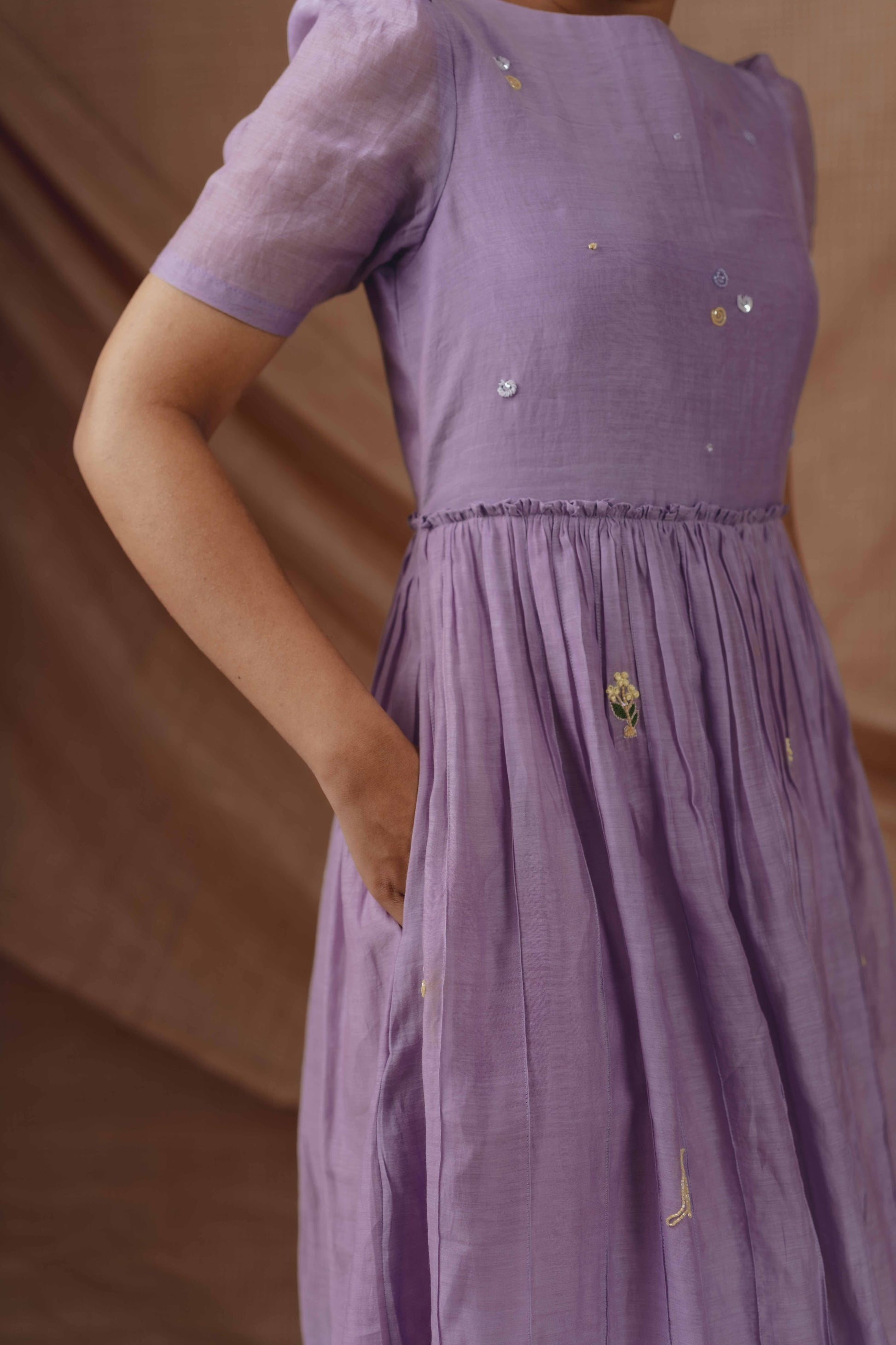A soft lilac silhouette crafted in breathable handwoven fabric, detailed with delicate tonal pintucks and hand-embroidered motifs. Light, fluid, and thoughtfully made for everyday elegance.