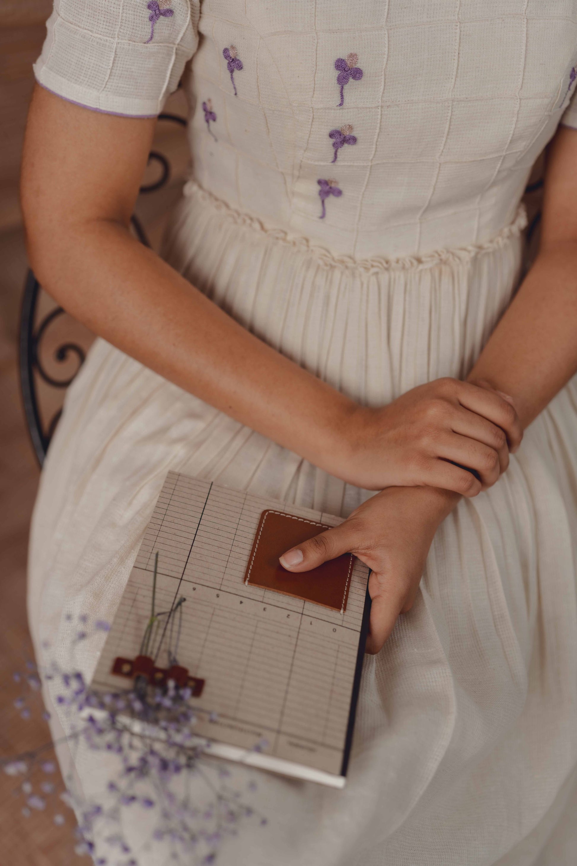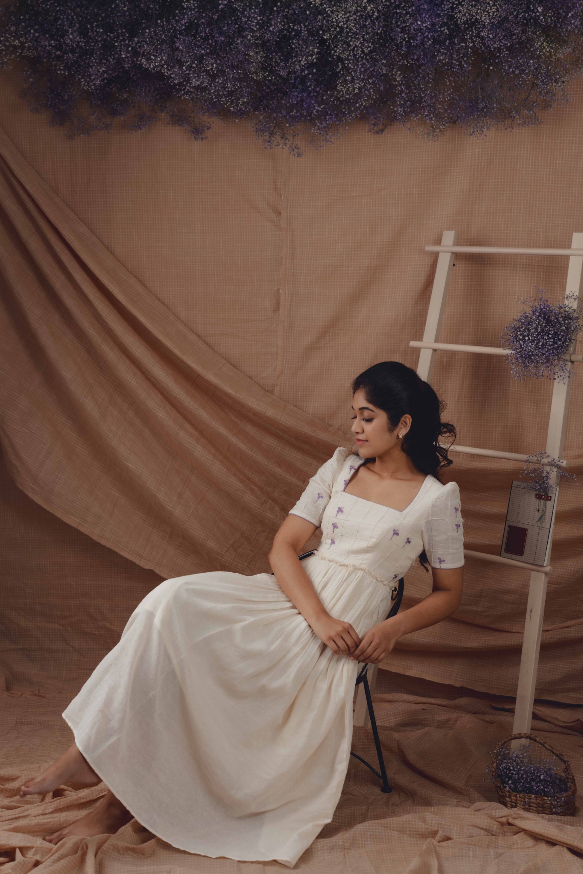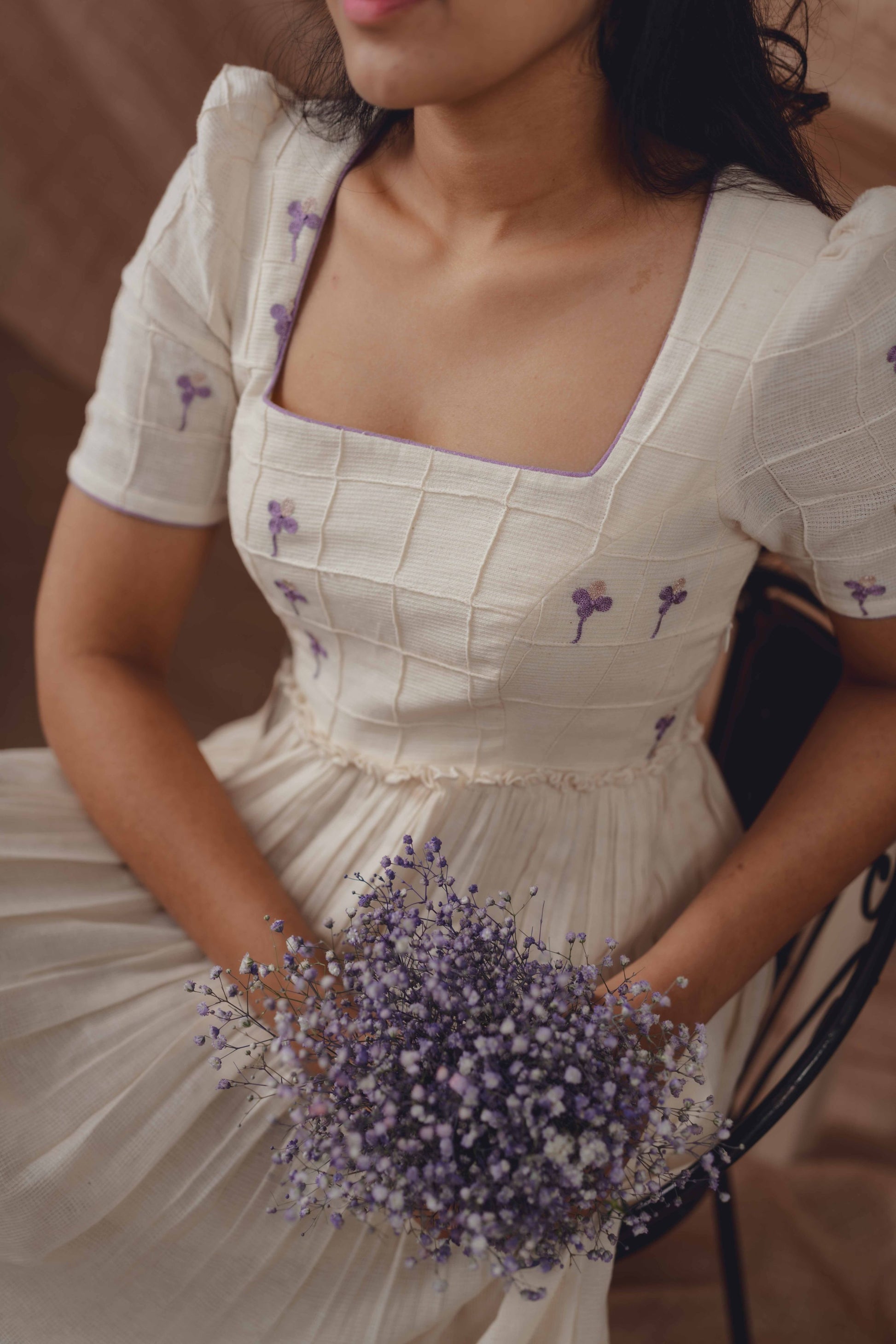 A delicate interplay of lilac and half-white, this handwoven dress features subtle pintuck textures and tiny hand-embroidered floral accents. Designed to feel light, airy, and effortlessly refined.