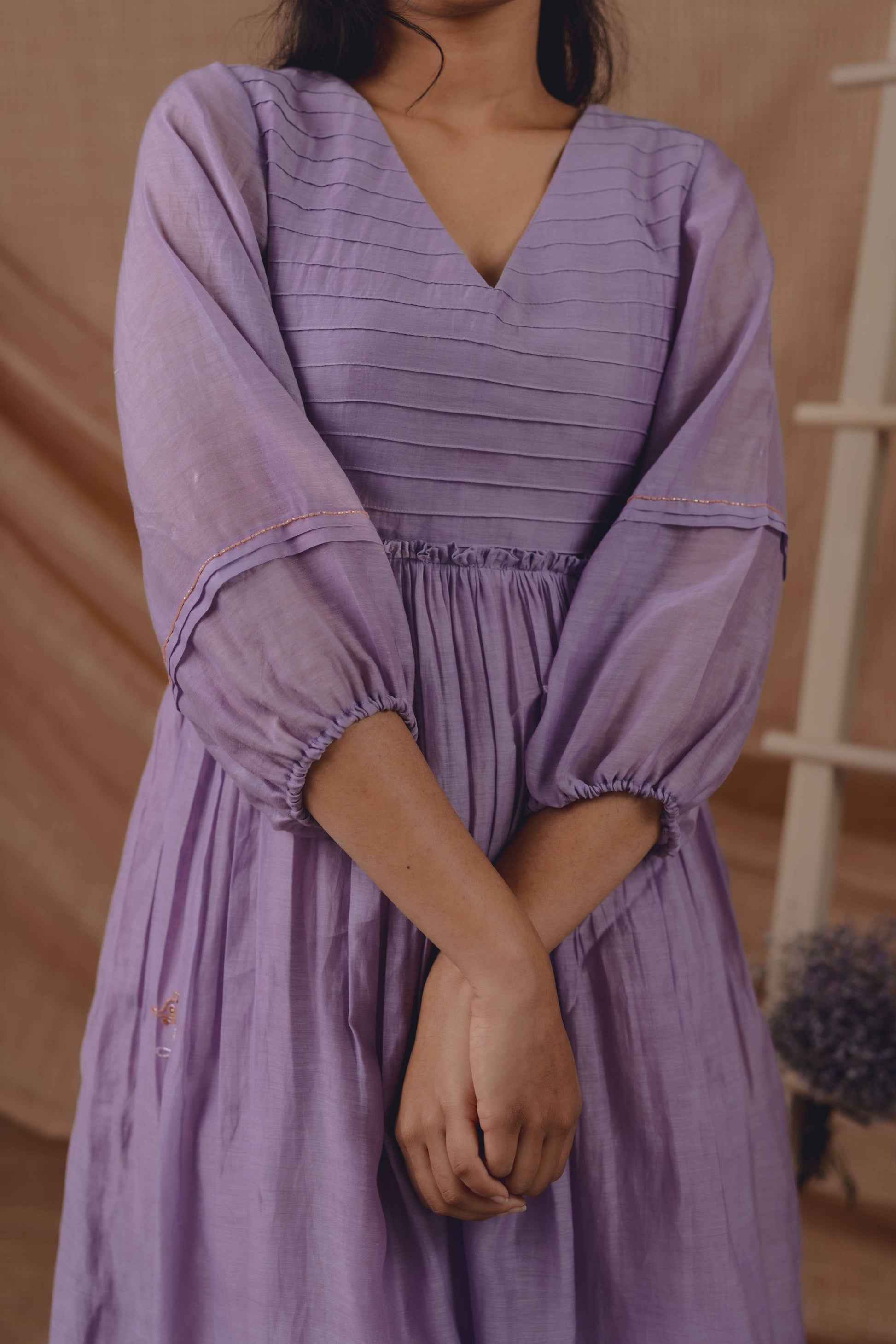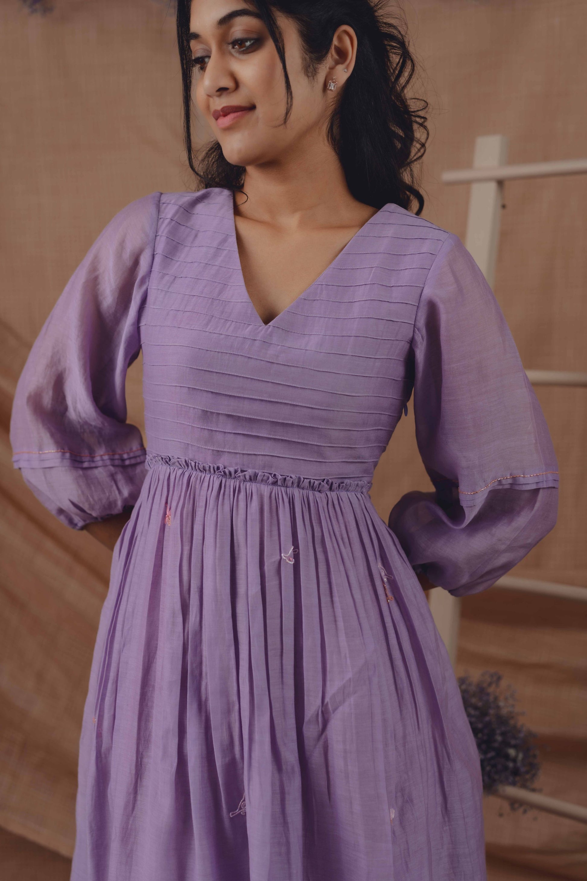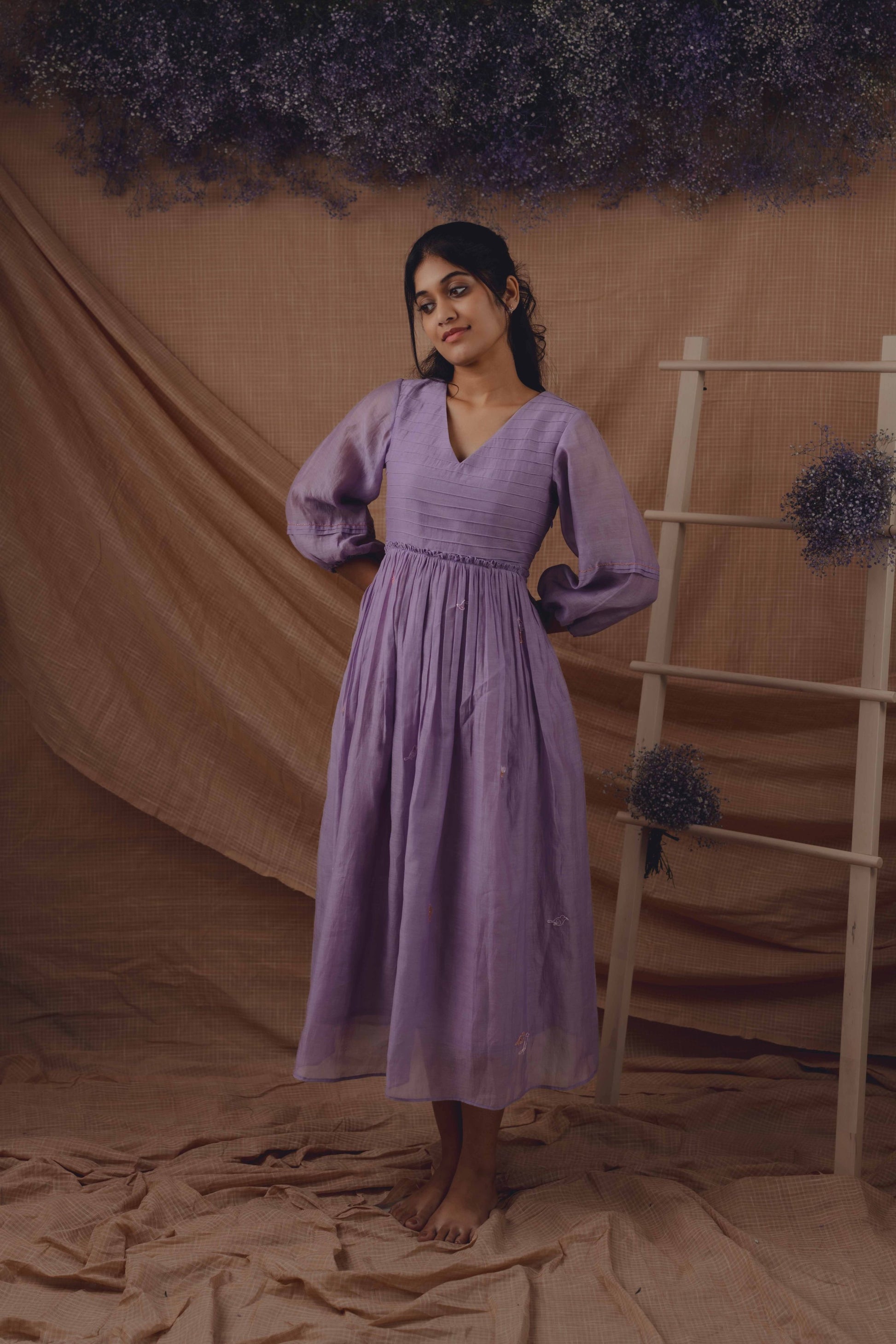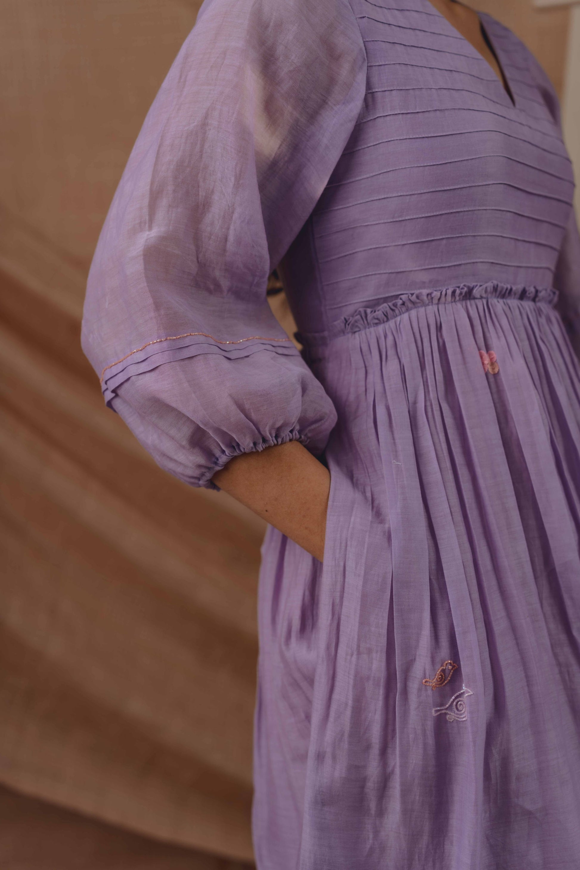 A softly structured lilac dress crafted in breathable handwoven Chanderi , designed to move with ease and grace. The bodice features fine horizontal pintuck detailing that adds subtle texture, while the gently gathered waist flows into an airy, voluminous skirt. Delicate hand-embroidered motifs scattered across the surface bring quiet charm. Finished with soft, billowy sleeves and a flattering V-neckline, this piece blends comfort with understated elegance.