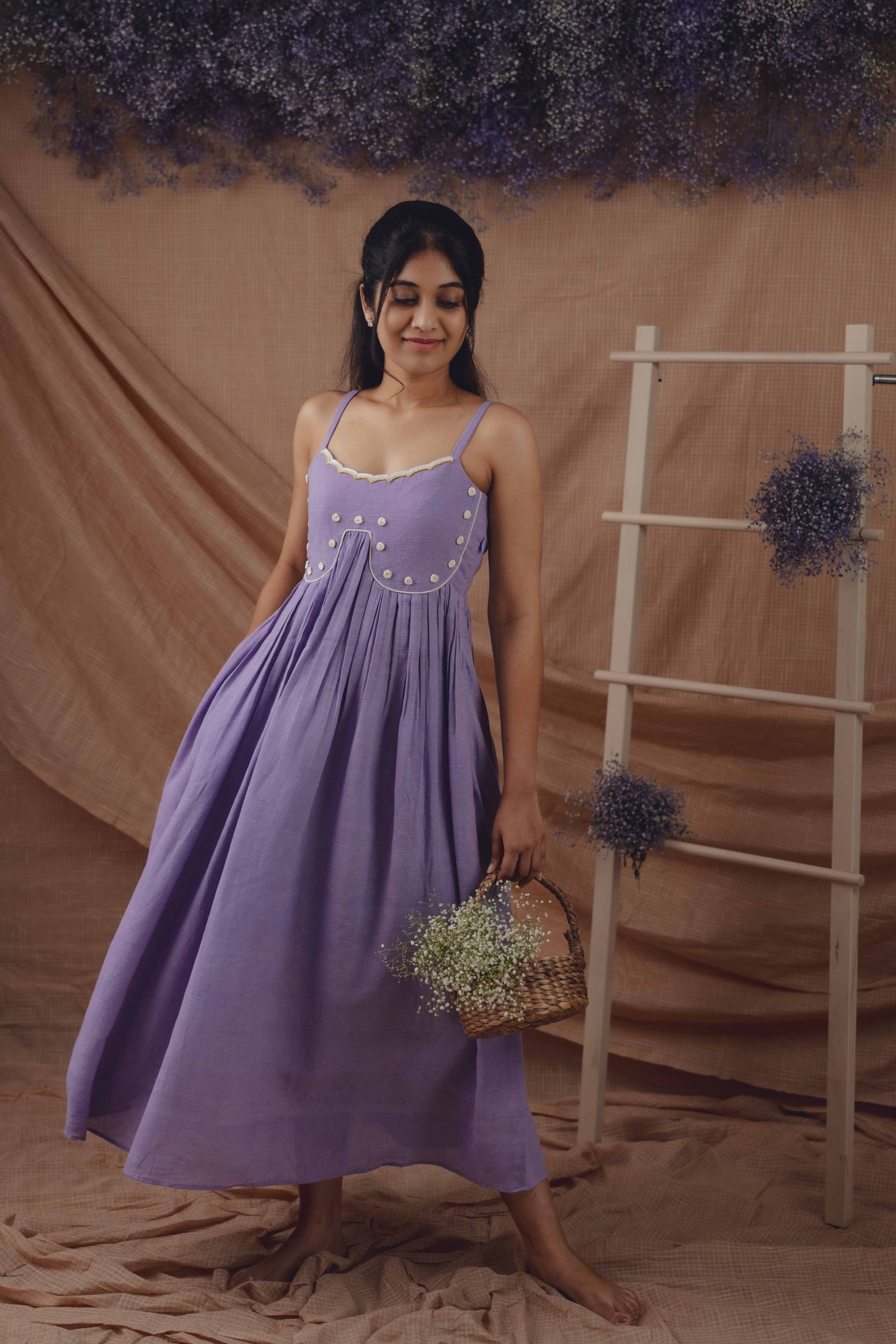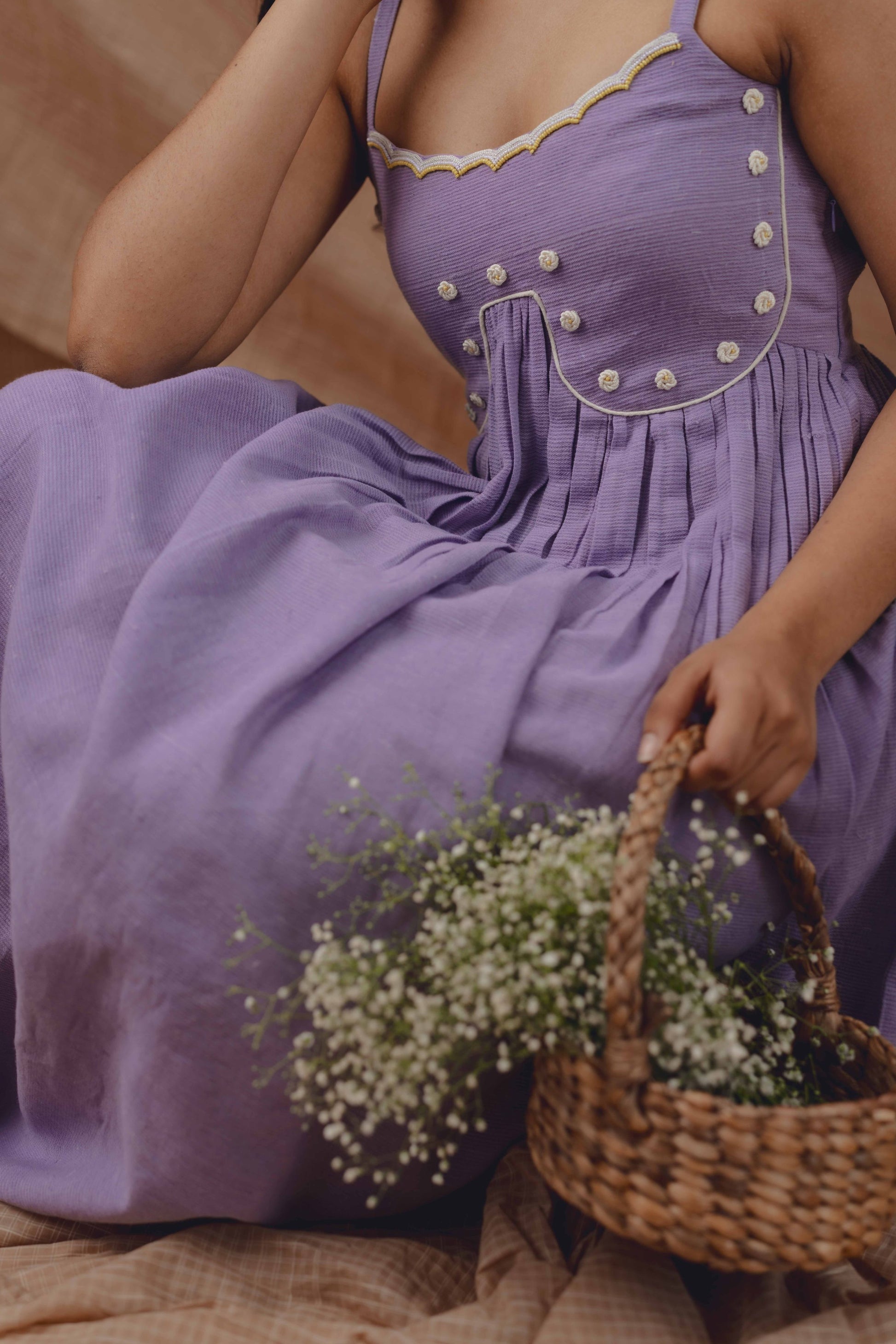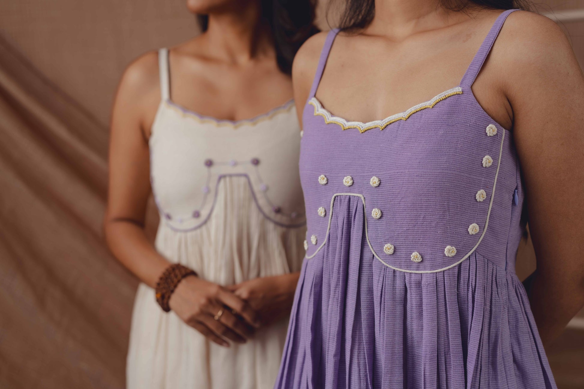 A soft lilac dress designed for effortless ease and gentle movement. Crafted in breathable handwoven fabric, this piece features a delicately shaped bodice highlighted with subtle contrast piping and hand-embroidered dot details. The gathered skirt flows freely, creating an airy, fluid silhouette that feels light on the skin. Designed with slim shoulder straps and a softly contoured neckline, this piece is perfect for slow days, warm light, and quiet moments.